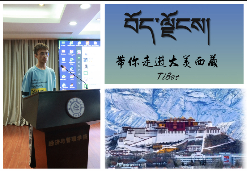 其后,旦增优旦同学全方位展示了真真正正的大美西藏。“青春没有售价,硬座直达拉萨”,“住进布达拉宫,我是雪域最大的王;流浪在拉萨街头,我是世间最美的情郎”……经幡飞扬,日照金山,藏面酥油茶,这就是西藏的魅力。一张张美丽图片,描绘着西藏各市风光,拨动着现场每一位同学的心弦。