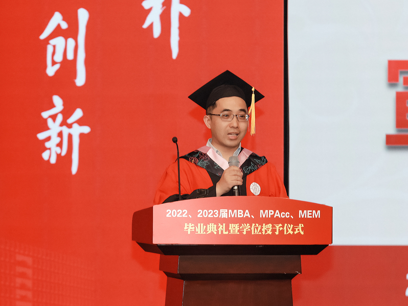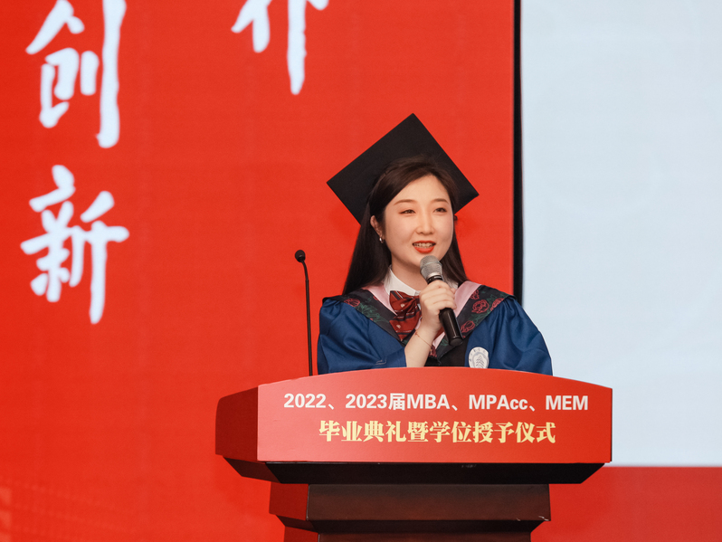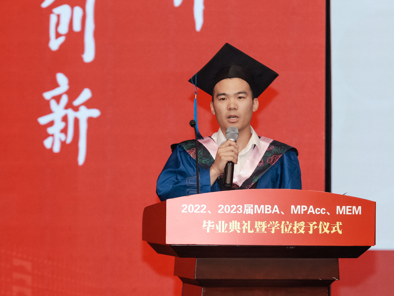 教师引领,学生奋进,逐梦之旅,所遇皆坦途。优秀毕业生代表曹雅婷、陈权全分别发言。他们向学校、学院、MBA教育中心表达了深深的感激之情,认为研究生求学之路,让他们领悟到“立己达人”的责任与担当,绘制了未来以梦为马,不负韶华的新篇章。但愿此去繁花似锦,再相逢依然如故。