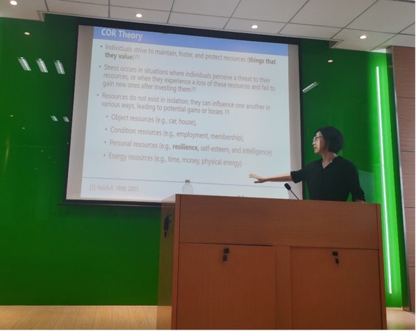 讲座从以下四个方面展开:第一,问题提出。龚元元介绍了员工心理韧性的定义以及心理韧性对员工情绪、工作态度和压力影响的研究现状,发现缺乏关于员工心理韧性对员工行为结果的影响以及影响情景因素的探究。第二,理论模型构建。龚元元围绕员工心理韧性是否会影响员工的工作投入和员工所拥有的工作和家庭资源如何调节上述关系阐述了理论模型构建过程。同时,龚元元对个体所拥有的资源类型以及资源保存理论中的资源获取螺旋和资源丧失螺旋等观点进行介绍。第三,假设推演。龚元元基于资源保存理论的观点阐述了员工心理韧性对员工工作投入的积极促进作用,以及员工的工作资源——资质过剩和家庭资源——养家动机对员工心理韧性对员工工作投入的影响的强化作用。第四,研究设计和实证检验。龚元元介绍了其研究团队的数据收集过程以及数据分析和假设检验步骤。第五,研究结果的讨论。龚元元结合其所得到的研究结论对理论和实践意义以及未来研究展望进行介绍。