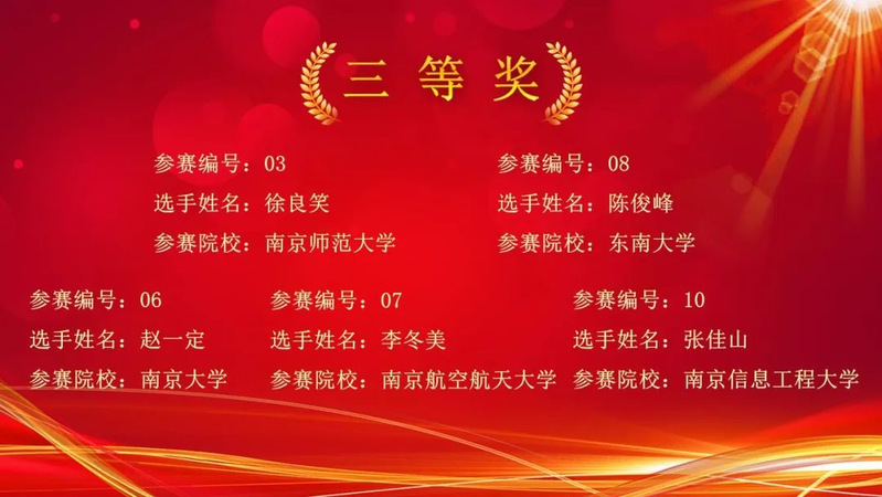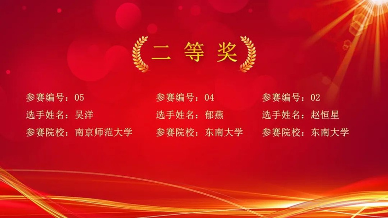 最后,在大家的共同见证下,颁奖盛典正式公布个人荣誉奖项和团队荣誉奖项获奖名单。南京师范大学王子豪、p站 孙旭荣获一等奖;南京师范大学吴洋、东南大学郁燕、赵恒星荣获二等奖;南京师范大学徐良笑、东南大学陈俊峰、南京大学赵一定、p站 李冬美、南京信息工程大学张佳山荣获三等奖。南京师范大学获得团队一等奖,东南大学获得团队二等奖,p站 获得团队三等奖。
