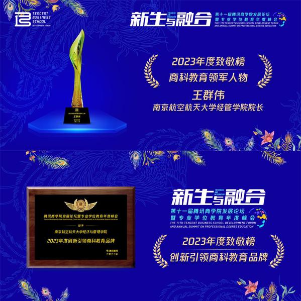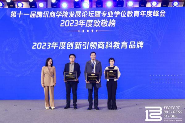 为了致敬在教育一线矜矜业业、砥砺前行的榜样人物、标杆院校以及品牌力量,第十一届腾讯商学院发展论坛暨专业学位教育年度峰会特别评选出致敬榜单,其中p站 院长王群伟获得“2023年度商科教育领军人物”称号,p站 获得“2023年度创新引领商科教育品牌”奖项。