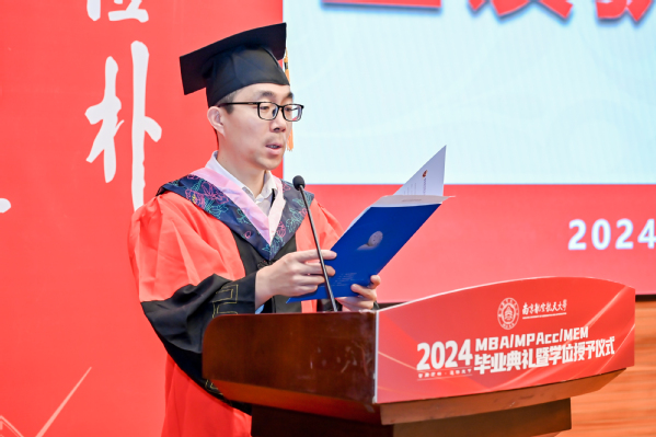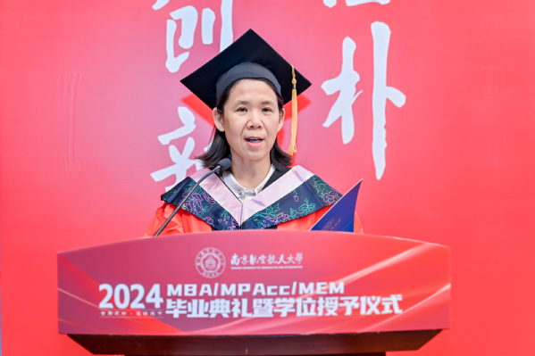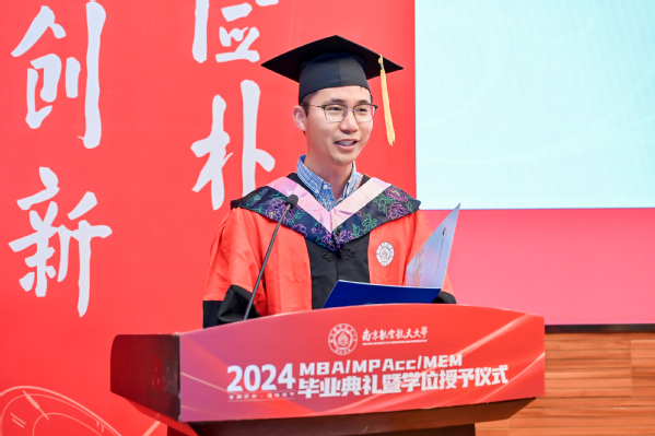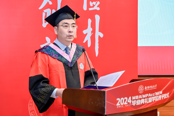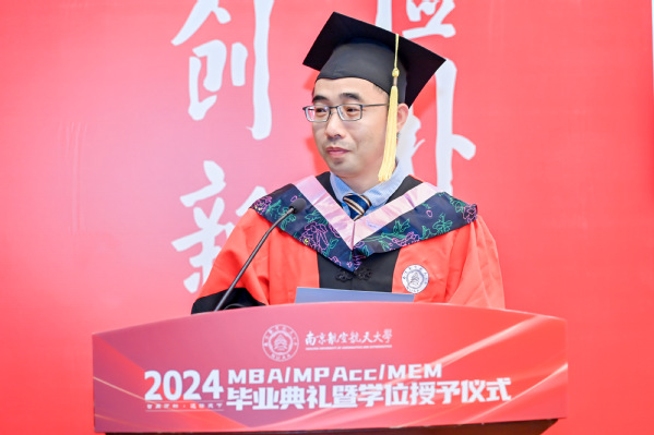 学位授予仪式之后,p站 党委书记苏州代表学院寄语全体毕业生。苏州书记表示,2024年是特殊的一年,同学们毕业之年恰逢学院建院40周年,学院锐意改革、勇于攀登,实现了创业起步、快速发展、全面腾飞三个阶段的跃升,目前正步入更高质量发展的新阶段;2024年是喜悦的一年,学院通过BGA国际认证,标志着学院教育质量和办学水平得到国际认可,以商学院国际认证为牵引的可持续发展机制正在加快形成;2024年是改革的一年,学院正在推进非全研究生教育改革,思考和践行如何完善培养方案与课程体系,如何更好地产教融合、让学生更深入了解中国的商业实践和商业环境,如何发挥南航的多学科优势、开设更多“科技+商业”特色班,如何扩大与国外高水平商学院合作、为学员提供更多国际化体验;如何改善办学条件为同学们提供更优良的学习环境;如何建设学院的校友平台、更好发挥校友作用、更好为校友服务。苏书记希望2024届毕业生,珍惜南航之缘、师生之情、同窗之谊,与母校母院情感与共、发展与共、荣辱与共,在追求理想、成就事业的同时,继续关心母院的建设发展,支持母院、宣传母院。最后,他向毕业生发出诚挚的邀请,建院40周年之际,欢迎大家常回家看看,携手出发共创永续发展!