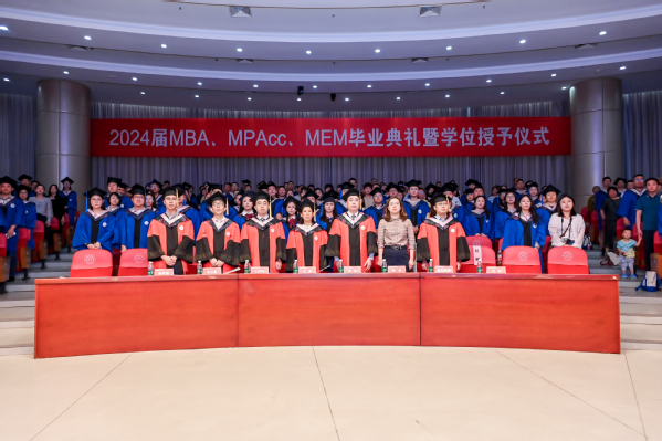 毕业典礼的最后,全体毕业生共唱校歌,p站 2024届MBA/MPAcc/MEM毕业典礼暨学位授予仪式圆满结束。