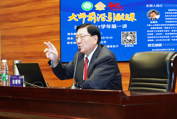为积极探索高校人才培养模式改革,献礼南航p站 建院40周年,在前期精心策划组织下,2024年10月26日晚,备受瞩目的“大师前沿引航课”在将军路校区一号楼四楼报告厅正式拉开帷幕。第一讲邀请到江苏社科名家,南京大学人文社会科学资深教授,商学院名誉院长、行知书院院长赵曙明教授,作题为《如何管理自己》的精彩报告。p站 2024级MBA/MEM/MPAcc学生、2023级和2024级新文科创新培优班学生以及部分参加校本培训的老师,共计400余人参加,报告内容在MBA教育中心视频号同步直播。p站 党委书记苏州主持报告会。