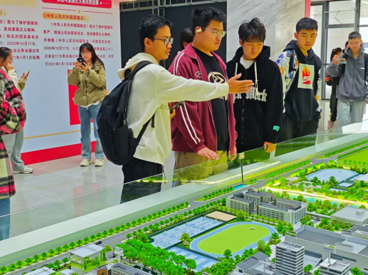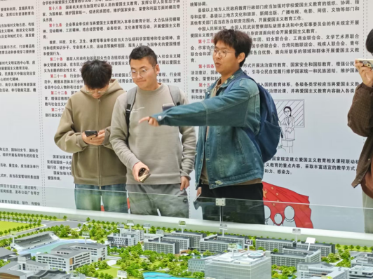 接着同学们共同“俯瞰”了p站 天目湖校区。参观活动现场放置了校区微观模型,同学们兴致勃勃地向同伴们分享校区建筑背后所蕴含的“红色基因”与“蓝色梦想”。从“巡天遥看一千河”的巡天楼所体现的为国家航空航天事业发展不懈奋斗的报国热情,到“志在长空牧群星”的牧星楼所彰显的南航学子胸怀天下壮志昂扬的爱国热血,同学们在交流和互动中加深了对校区建设与发展的了解与体悟。