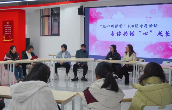 “经心周课堂”栏目主创成员在天目湖校区B8“一站式”学生社区115开展“与你共话‘心’成长”——百期总结交流活动,学院党委副书记胡苹、辅导员胡心雨共同参与此次活动。