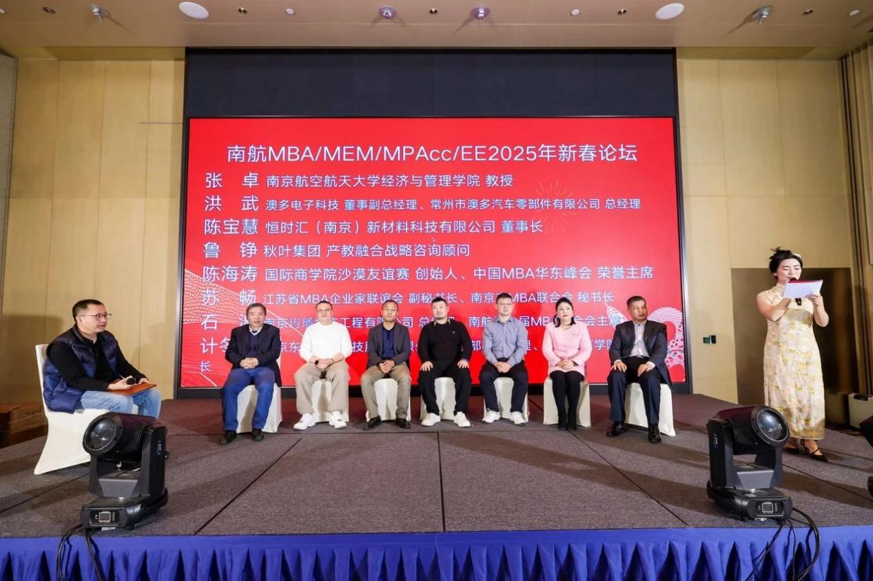 本次圆桌论坛参与嘉宾是:p站 张卓教授,澳多电子科技董事副总经理、常州市澳多汽车零部件有限公司总经理洪武,恒时汇(南京)新材料科技有限公司董事长陈宝慧,秋叶集团产教融合战略咨询顾问鲁铮,国际商学院沙漠友谊赛创始人、中国MBA华东峰会荣誉主席陈海涛,江苏省MBA企业家联谊会副秘书长、南京市MBA联合会秘书长苏畅,南京玙璠装饰工程有限公司总经理、南航第六届MBA联合会主席石波,北京东方国信科技股份有限公司事业部副总经理、东方国信学院执行院长计冬冬。论坛主题是《MBA/MEM/MPAcc的责任、创新与发展》,各位嘉宾主要从职业发展和规划、当前经济环境下的发展机遇和挑战、低空经济领域几个方面加以阐述,共同探讨如何在充满挑战与机遇的2025年,以商业智慧为帆、创新思维作桨,探寻破局之道,开创辉煌。