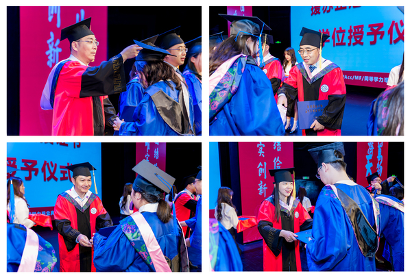 学院领导、学院学位评定委员会成员和导师代表共同为毕业生正冠拨穗、颁授证书并合影留念。