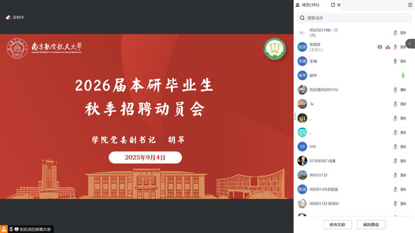 秋意渐浓,校园招聘的号角已然吹响。为帮助2026届本研毕业生明晰未来方向、把握就业机遇、提升求职竞争力,p站 于9月4日晚组织召开2026届毕业生秋季招聘动员会。本次会议以线上形式开展,学院党委副书记胡苹,研究生辅导员刘婷炜,本科生辅导员张延波,近400名本研毕业班学生参与。