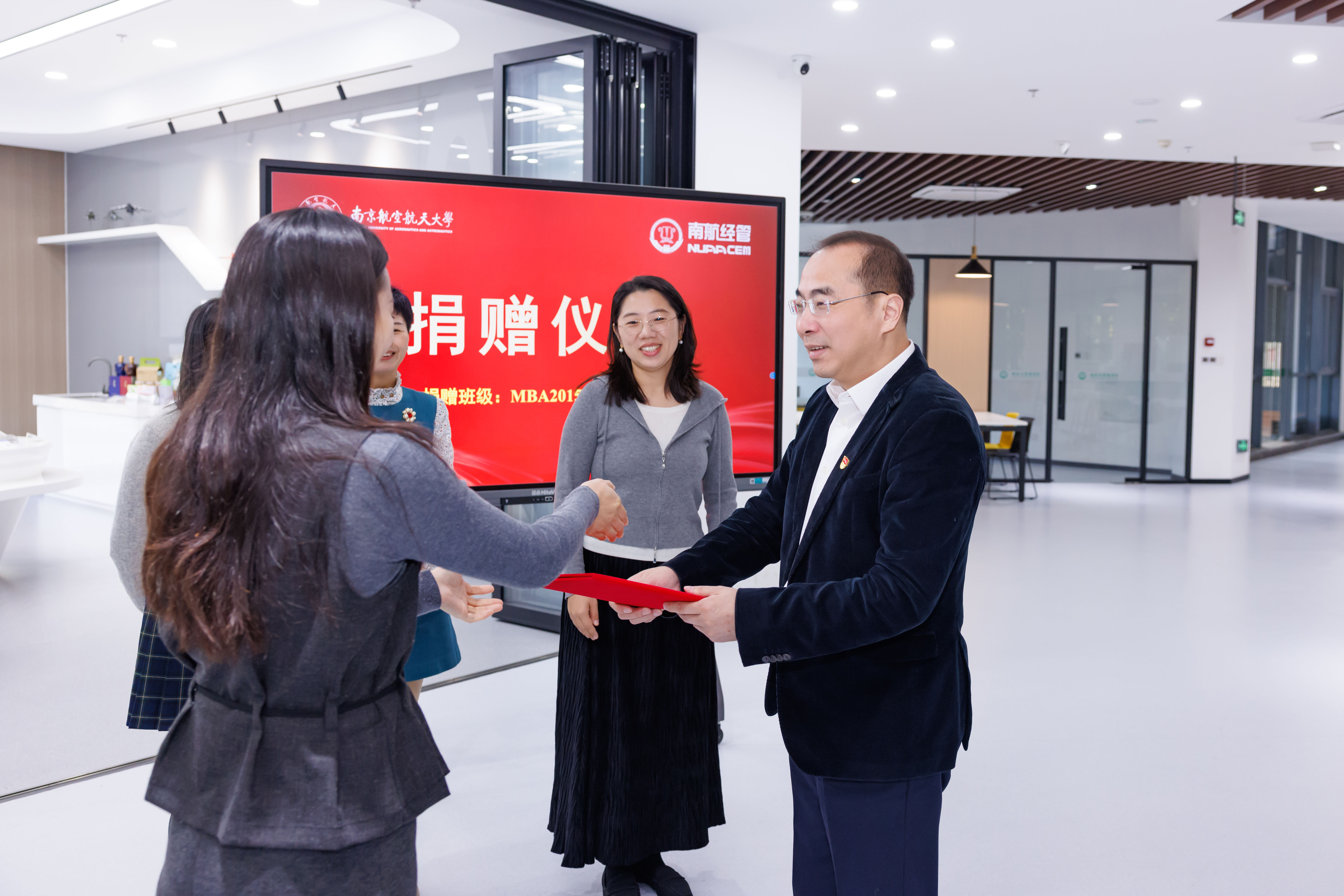 在温馨的氛围中,校友代表将承载着关爱的捐赠支票赠予受捐人,薄薄的支票寄托着校友们对学子成长成才的殷切期盼。苏州书记向捐赠代表颁发了捐赠证书和纪念品,现场的掌声既是对校友爱心捐赠的由衷赞许,也体现了南航经管精神情感的延续。