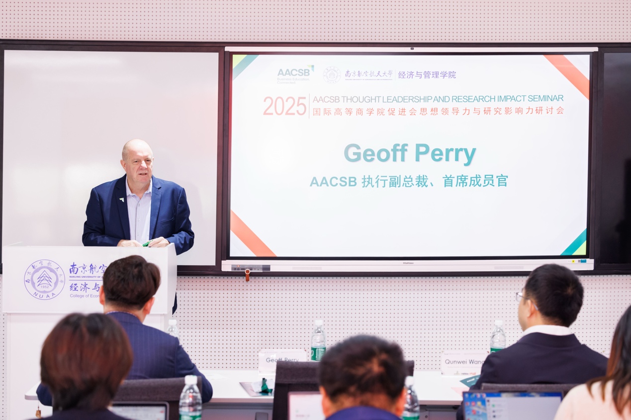 Geoff Perry对南航p站 承办此次研讨会以及参会商学院代表们的支持表示感谢。Geoff Perry认为,AACSB认证为全球商学院提供了一个战略框架,助力院校明确使命、规划愿景。他强调认证价值不仅在于最终获得的认可,更在于整个认证过程中的持续改进与提升,这一过程帮助院校在既定方向上不断优化,实现高质量发展。此外,Geoff Perry介绍了AACSB在全球的布局及其对亚太地区,尤其是中国商科教育的重视。他表示,AACSB致力于与中国商学院紧密合作,通过认证、会员服务及全球网络,共同推动商科教育的创新与发展。