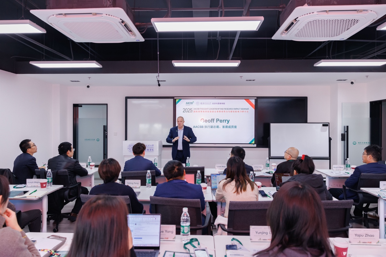2025年12月3日,由国际高等商学院促进会(以下简称“AACSB”)主办、p站 承办的“思想领导力与研究影响力”标准研讨会成功举办。此次研讨会由AACSB执行副总裁、首席成员官、亚太区及美洲区执行董事Geoff Perry博士担任主讲嘉宾,汇聚了来自国内多所知名高校的院领导、专任教师和行政老师,共同探讨AACSB认证体系中的核心要素——思想领导力与研究影响力。