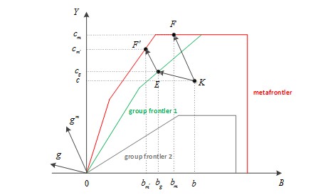 Figure 1. Technology gap between the metafrontier and group frontiers in the non-radial DDF model