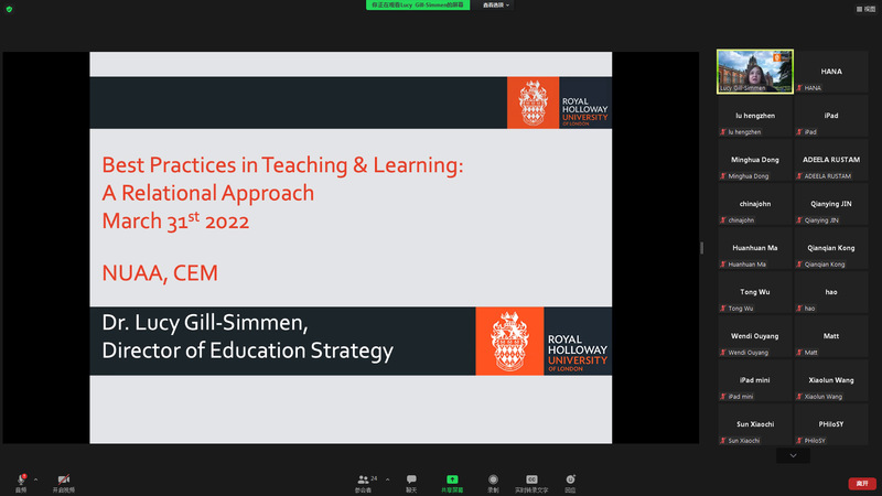 RHUL is one of the most important strategic cooperative partners of CEM, NUAA. This lecture was one of the series of the promotion program of  NUAA-RHUL Global Strategic Partnership. It is of great significance for young scholars to learn advanced teaching methods, as well as to encourage potential cooperation and deepen the relationship between us.